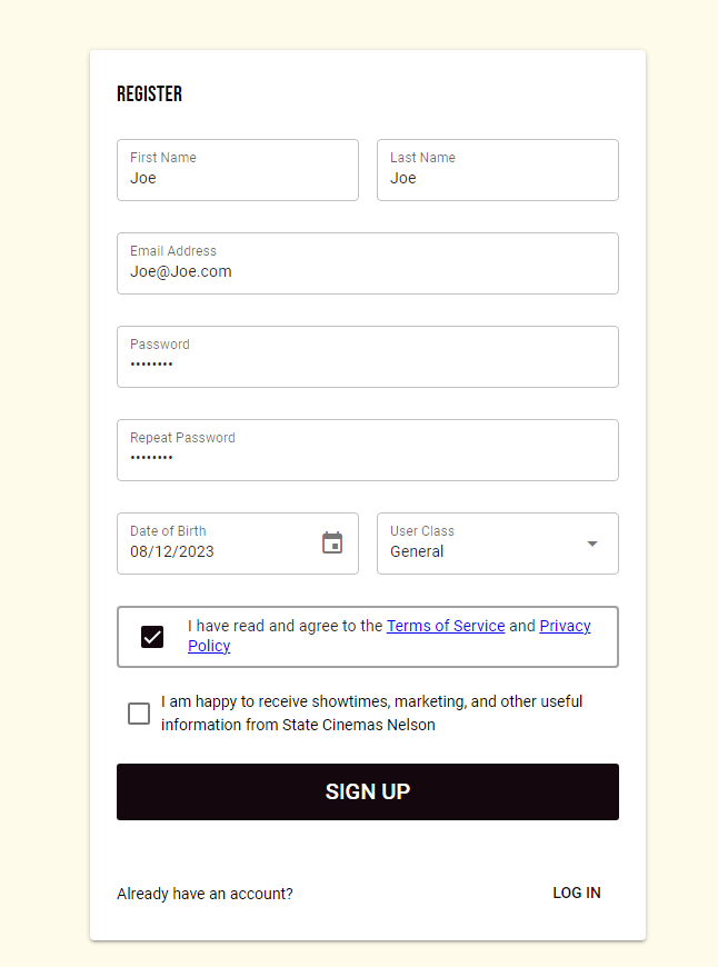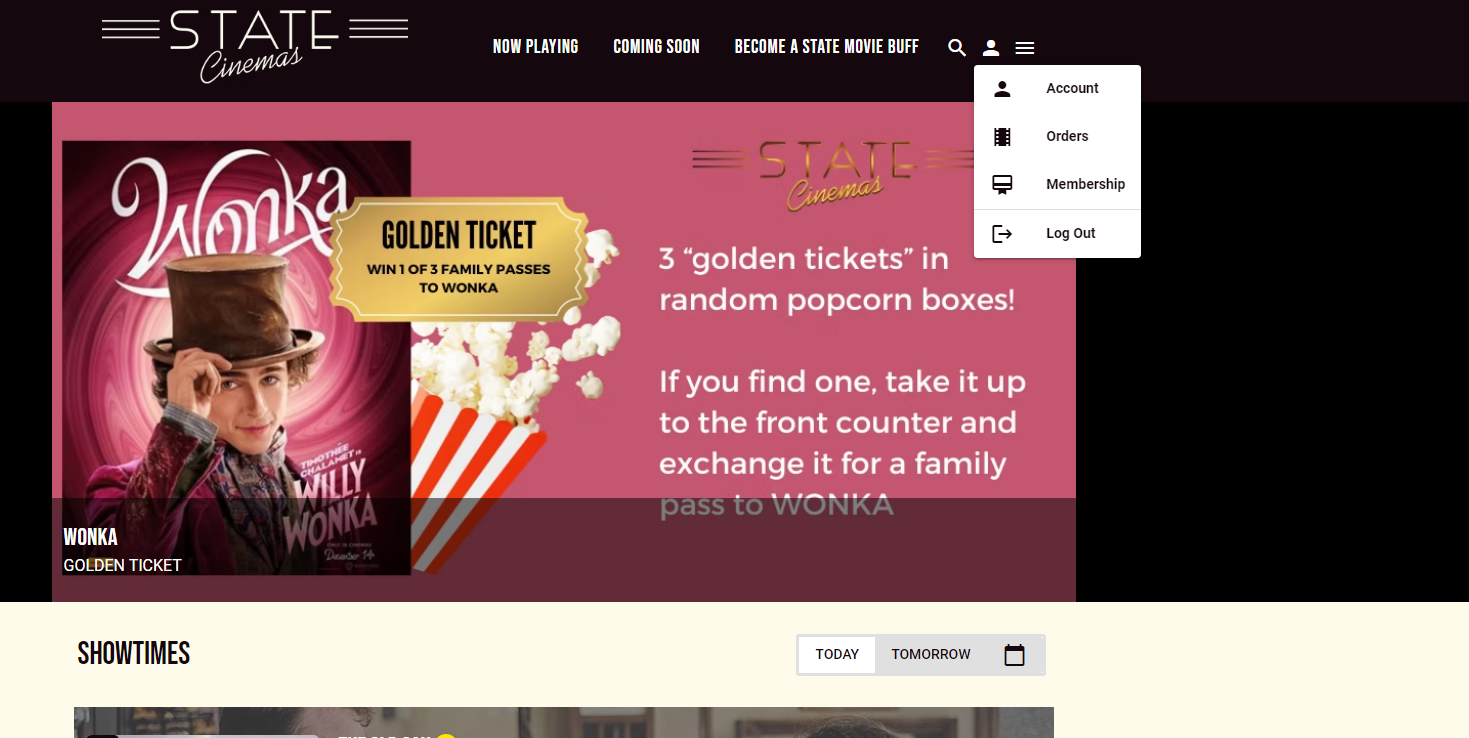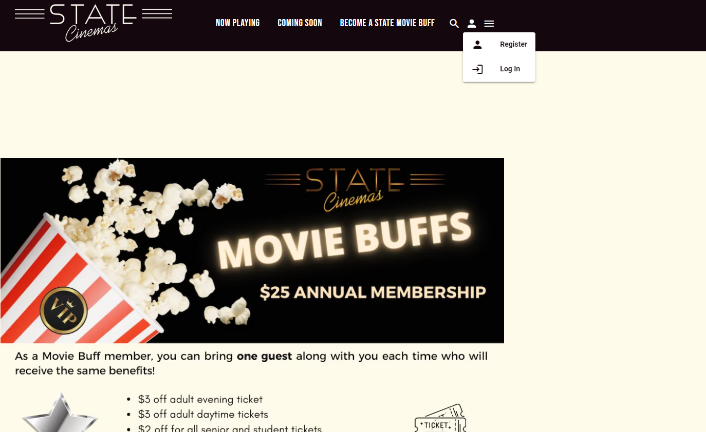 1. If you have ever booked online before, it's likely you have an account or a General account at State Cinemas. Select the tiny little white person on the header and select, "Log In"